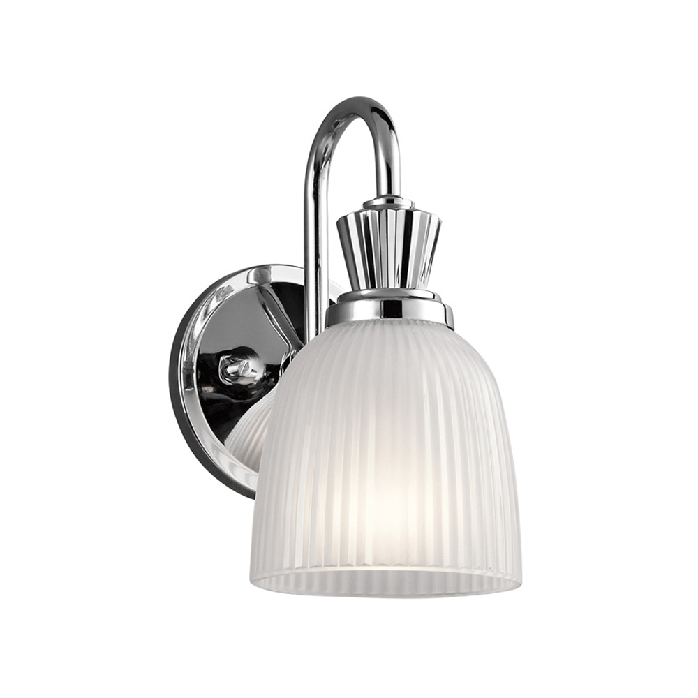 Бра Elstead Lighting KL-CORA1-BATH. Светильник использует светодиодные лампочки и отличается изящными изогнутыми и чистыми линиями, которые добавляют как раз нужное количество обновленного стиля его облику. Плафон в виде колокола из прозрачного рифленого стекла, с травлением на внутренней поверхности, красиво размещается на хромированном держателе. Основание выполнено в отделке - Хром. Идеально подойдет для освещения ванной комнаты, степень защиты IP44.