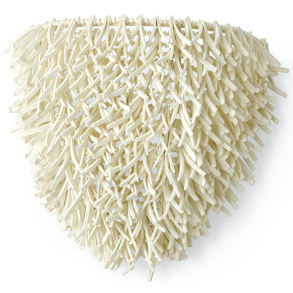 Вырезанные вручную кокосовые раковины в форме перьев с деревянными бусинами в кремовой отделке пришиты к металлическому каркасу с порошковым покрытием и дополнены тонко сплетенными деталями из белой абаки. Бра поставляется с кремовой задней панелью. Рекомендуется профессиональный монтаж.