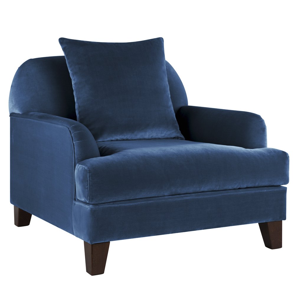 Глубокий синий цвет обивки кресла – легко добавит в интерьер яркость и индивидуальность. Бархатная обивка долговечна и хорошо выдерживает повседневное использование. А дополнительная подушка – служит эстетическим элементом.