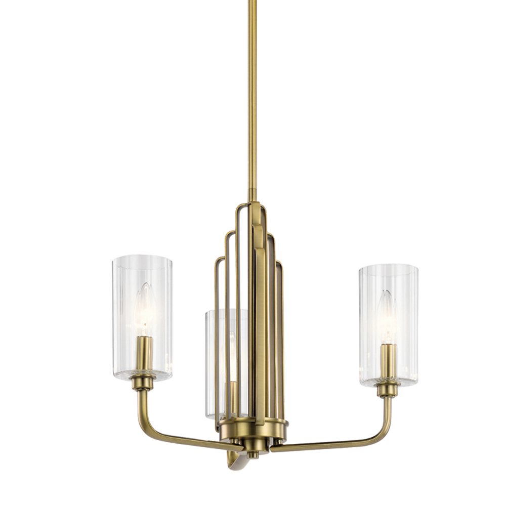 Люстра Elstead Lighting QN-KIMROSE3-BNB. Шедевр в стиле ар-деко. Плафоны изготовлены из прозрачного рифленого стекла с вертикальными желобками для мягкого эффекта игры света. Для обычного освещения без эффектов просто снимите плафоны. Основание в цвете - Матовая латунь, полированный никель. Идеально подойдет для освещения гостинной, кухни, спальни, столовой. Поставляется в комплекте со стержнями 1х152 мм и 3х305 мм