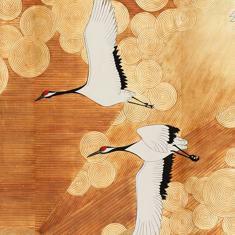 Воплощение роскоши и утончённости — искусные обои с грациозными журавлями и изящными спиральными узорами из сусального золота на текстурированной бумаге. Они идеально подойдут практически для любых интерьеров в классическом или современном стиле, добавляя изысканности в рабочий кабинет, просторную спальню или светлую гостиную.